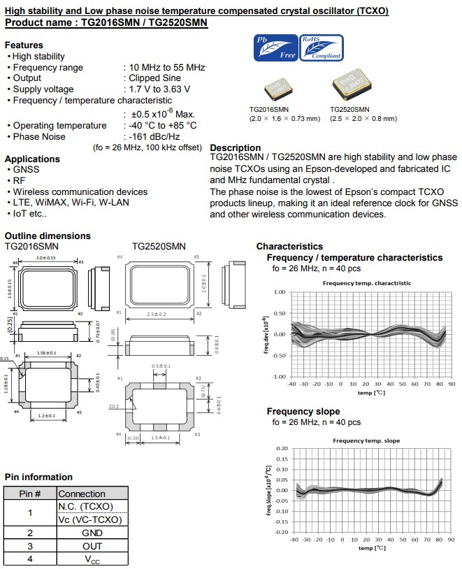 愛普生晶振TG2016SMN / TG2520SMN是高穩定性低相 使用愛普生開發和制造的IC的噪聲TCXO和MHz基頻晶體。相位噪聲是愛普生緊湊型TCXO中最低的產品系列,使其成為GNSS的理想參考時鐘 和其他無線通信設備。