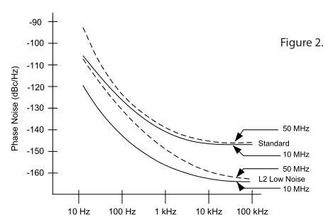 圖1中B區的噪聲稱為“1/F”噪聲,是由半導體活動引起的.采用低噪聲“L2”晶體振蕩器的設計技術將其限制在非常低的,通常無關緊要的值.圖1的區域C稱為白噪聲或寬帶噪聲.“L2”晶體振蕩器中的特殊低噪聲電路相對于標準設計提供了顯著的改進(15-20dB).當采用倍頻從較低頻率的晶體獲得所需的輸出頻率時,輸出信號的相位噪聲增加20log(倍增因子).這導致整個電路板上的噪聲降低大約為6dB,用于倍頻,10dB用于頻率三倍,20dB用于十倍乘法.