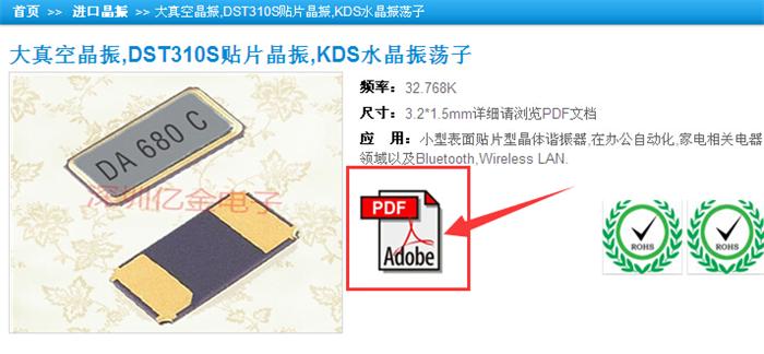 第四步,點擊之后會跳轉(zhuǎn)到DST310S石英晶振產(chǎn)品詳細(xì)頁面,從介紹中我們可以看到頻率,尺寸和應(yīng)用,從尺寸中我們可以看到是符合要求的3.2*1.5mm,這時我們大致可以確認(rèn)客戶要找的就是這顆料,為了更利于客戶選定產(chǎn)品我們官網(wǎng)上的每一個晶振產(chǎn)品都有放上PDF規(guī)格書,我們可以免費下載了解更多詳細(xì)參數(shù).