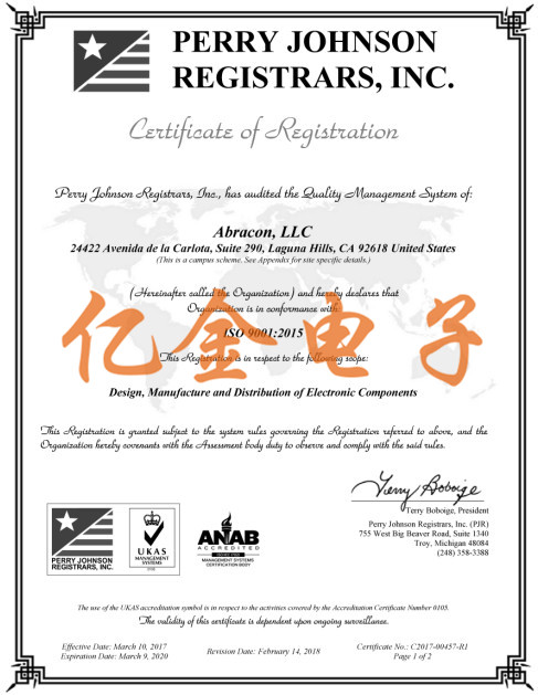 美國Abracon LLC是主要生產石英晶體,SMD晶振,有源晶振等頻率元件的知名制造商.產品均選用優異材料符合歐盟ROHS要求.Abracon晶振根據多德-弗蘭克華爾街改革和消費者的沖突礦產條款的要求2010年保護法案,繼續與我們所有合格供應商積極合作確保我們的產品不含任何不符合環保要求的材料.