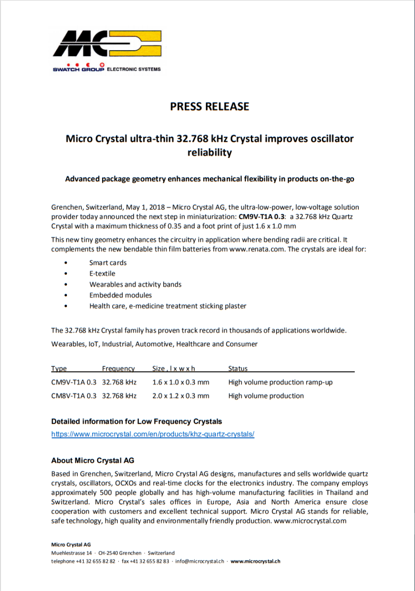 先進的晶體幾何形狀可實現更小的封裝,瑞士格倫興,微晶晶振是世界領先的電子行業石英晶體、振蕩器、OCXO 和實時時鐘的領先供應商,現在提供采用僅 1.2 * 2.0 * 0.7 mm 的先進微型封裝的廣受歡迎的振蕩器。這種密封封裝將集成電路與XTAL一起承載。它可承受惡劣的環境條件。除了大電源電壓范圍外,它還具有非常低的功耗。在有源模式下,驅動一個CMOS負載時功耗低至0 μA。由于振蕩器也以待機模式(i= 45.1 μA)運行,因此可以瞬間獲得準確的頻率,因此必須注意延遲啟動時間,例如典型的AT振蕩器。通過工廠校準,精度優于使用外部XTAL的解決方案。 1.6 to 5.5 V 的寬電源電壓范圍與 -40°C to + 85°C 的大工作溫度范圍、低功耗和小封裝尺寸相結合,使其成為未來應用的理想選擇