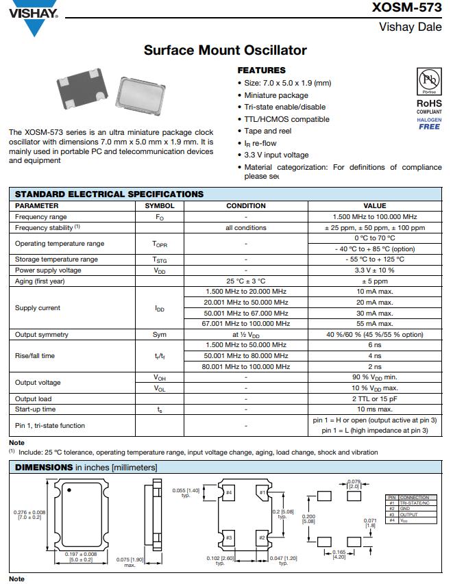 Vishay公司發布編碼XOSM-573-B-E-40M,型號XOSM-573,頻率為40.000MHz,電壓3.3V,工作溫度0°Cto70°C,XOSM-573系列是一款超小型封裝時鐘振蕩器,SMD振蕩器,它是主要用于便攜式PC機和電信設備和設備,產品具備高質量低抖動低電壓低相位的特點,產品主要特點:尺寸:7.0 x 5.0 x 1.9 (mm),微型包裝,三狀態啟用/禁用,TTL/HCMOS兼容,磁帶和卷軸,IR再流動,3.3 V輸入電壓,材料分類:用于符合性定義.