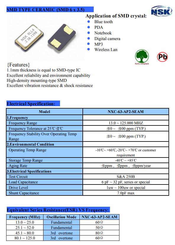 臺灣津綻晶振,NXC-63-AP2-SEAM晶振,6035二腳晶振臺灣津綻大陸代理,6035封裝,超小型表面貼片型SMD晶振型號,最適合使用在汽車電子領(lǐng)域中,也是特別要求高可靠性的引擎控制用CPU的時(shí)鐘部分.低頻晶振可從7.98MHz起對應(yīng),小型,超薄型具備強(qiáng)防焊裂性,NSK英晶體在極端嚴(yán)酷的環(huán)境條件下也能發(fā)揮穩(wěn)定的起振特性,產(chǎn)品本身具有耐熱,耐振,耐撞擊等優(yōu)良的耐環(huán)境特性,滿足無鉛焊接以及高溫回流溫度曲線要求,符合AEC-Q200標(biāo)準(zhǔn).